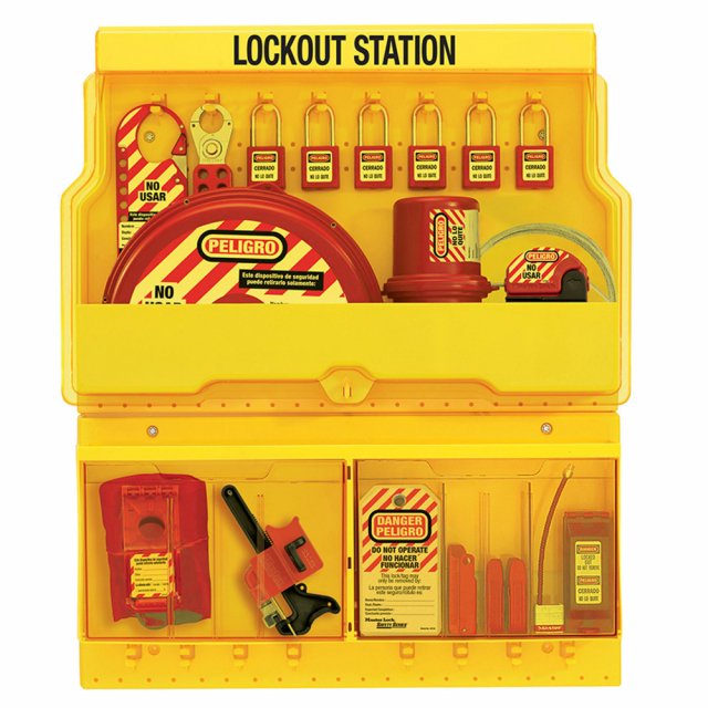 The Master Lock No. S1900VE410ES Deluxe Multilingual Spanish and English Safety Lockout Station, Valve and Electrical, is a deluxe capacity station with a durable construction to ensure long life in manufacturing facilities. Designed for departmental lockout needs, the station includes 16 hanger clips that each hold 2 safety padlocks or lockout hasps, and holes along the bottom made for optional peg hook hangers to hang bulky devices. Moveable dividers in top and bottom trays help organize devices. The lower section can hold a total of 150 lockout tags, with each compartment holding 25 lockout tags. The station includes a cover to keep out dust and grime. It can be locked using a combination padlock to limit access to authorized employees. The unit measures 23.5 in wide x 27 in tall x 4.5 in deep (596mm x 685 mm x 114mm). It comes equipped with 410RED Zenex™ Thermoplastic Padlocks, hasps, lockout tags and high-use valve and electrical lockout devices.