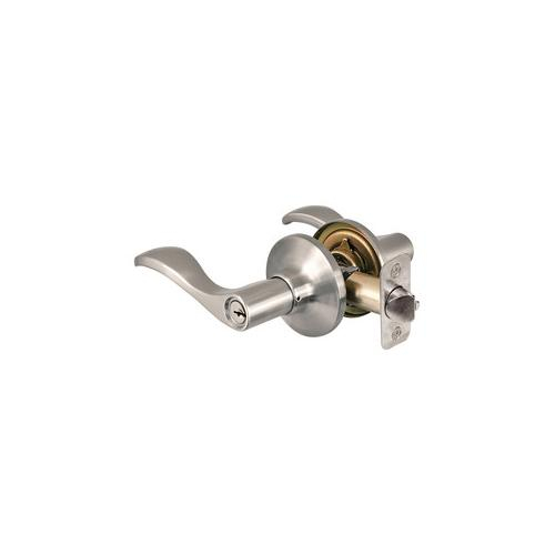 Features a wave-style lever with six-way adjustable latch to fit all doors with 2-3/8in or 2-3/4in backset, square, rounded corners, or drive-in. This lever offers ANSI Grade 3 performance for locked storage room applications. Operated by the lever inside or a key in the outside lever. Outside lever is always locked. Inside lever is always unlocked. The satin nickel finish provides a sleek appearance. Operates with SC1 cylinder.