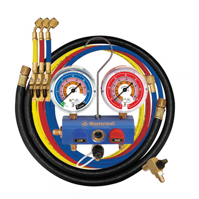 Mastercool, 51436, 3-Way 0.375" Ball Valve Manifold 36", 0.25" SAE Nylon Barrier Hoses, 0.375" SAE Vacuum Hose, 90° Swivel Vacuum Ball Valve