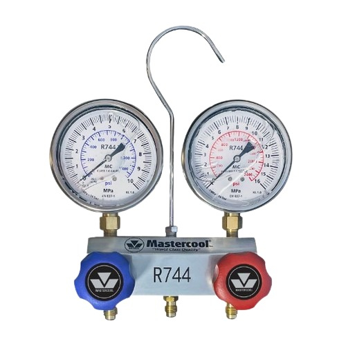 Mastercool, 55661-A, R744 (CO2) 2-Way Aluminum Manifold with Oil Filled Gauges and (3) 150 Cm Braided Hoses