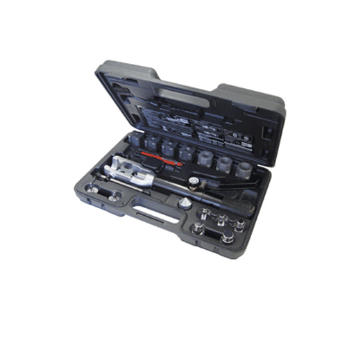 This kit features a hand-held hydraulic press that accurately flares and swages copper tubing. Once the die and adapter are secured in the fixture, a few pumps of the handle and you're done! This tool really takes the work out of swaging and flaring, especially on larger tube sizes.