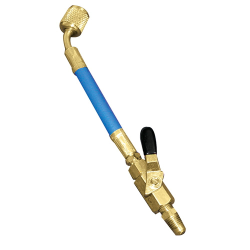 Blue 1/4" x 1/4" 45° Manual Shut-Off Valve. Ball valve design with flexible hose controls refrigerant with a quarter turn of the valve handle. Meets SAE, EPA and UL requirements for containment of refrigerant. Can be operated with one hand. Screws onto charging hose end.