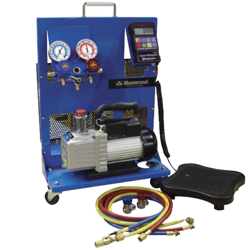 A lightweight, durable, steel frame cart that contains all the necessary tools to quickly and conveniently charge the A/C system. No need for different sized charging cylinders with Mastercool's rugged die cast electronic scale. Simply place the refrigerant cylinder on the scale and charge.