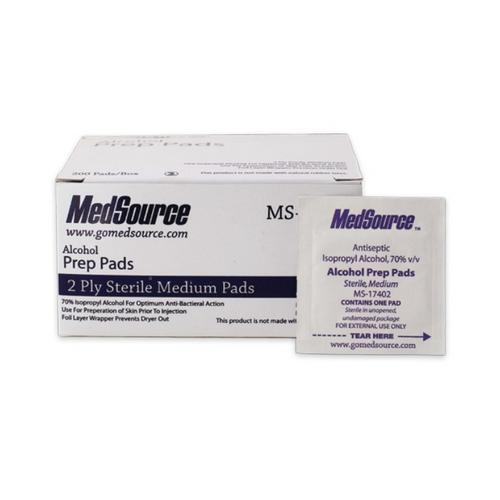 The MedSource Alcohol Prep Pads are 2-ply and used as a topical antiseptic to proctect against infection and contamination. The soft, absorbent, non-woven pads are saturated with 70% isopropyl alcohol solution. The four layer wrapper prevents the pad from drying out. This product does not contain natural rubber latex and is single use only