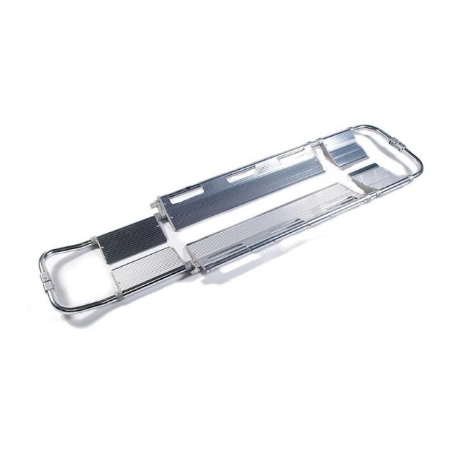 The MedSource Aluminum Break-Apart Stretcher is designed to be gently maneuvered under the patient without rolling or lifting. An open center permits the patient to be X-rayed while remaining immobilized on the stretcher. Composed of lightweight aluminum with an adjustable length and 3 patient restraint straps.