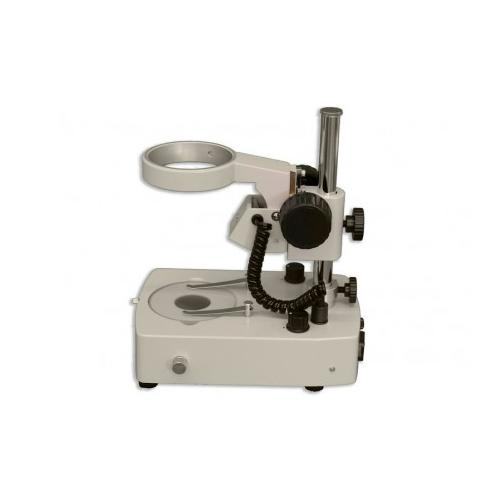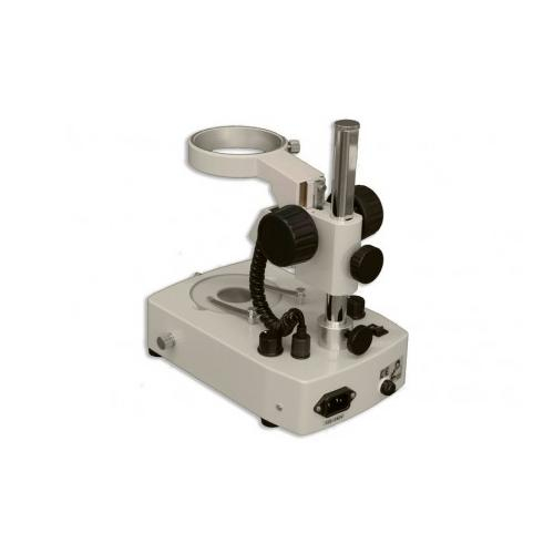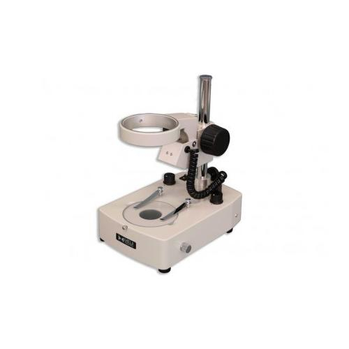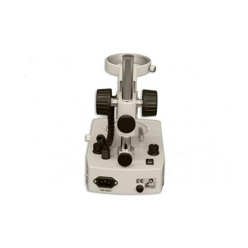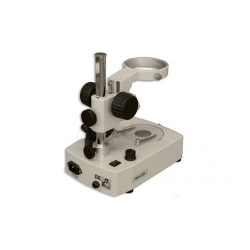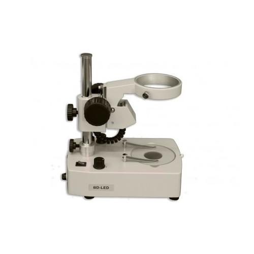 BD-LED is a pole stand with integrated focusing holder. Dual-reflection lens/mirror system provides both incident and transmitted variable intensity LED illumination, independently or simultaneously. Fully rotatable mirror in base provides transmitted brightfield or pseudo-darkfield illumination. Supplied with 94.5mm diameter clear glass stage plate and two stage clips. For use with zoom stereo bodies
