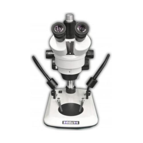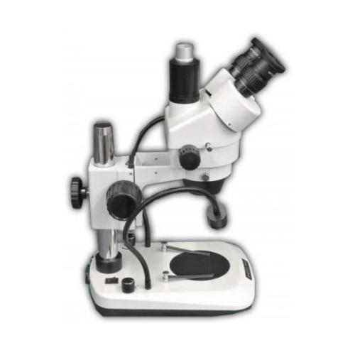 The EM-61 is a stereo microscope that consists of a EM-61/Head trinocular head that allows 7.5x - 45x magnification (with 10x eyepiece). It has a built-in 23 mm phototube attachment. Its illuminator is a dual arm LED incident light that is incorporated with the stand in which has transmitted light and includes variable intensity control and auto voltage. It has a 6.4:1 zoom ratio and 100 mm (4") Working distance