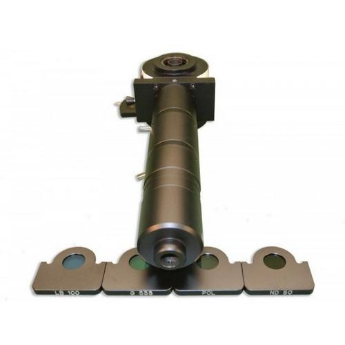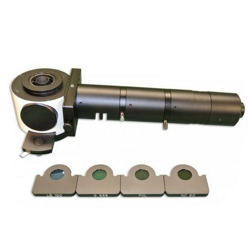 Vertical Koehler illuminator with sliding rotatable polarizer, infinity tube lens, focal length 200 mm., with clear blue, clear green and ND 25, neutral density and polarizing filter in metal mounts. Port to accept FL150/12 flexible 36" single flexible bundle light guide. For use with MC60, MC70 and FU3050.