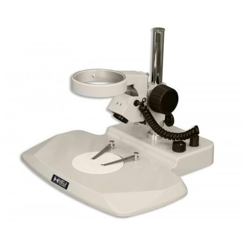 The PKL-1 Stand is most popular LED stand with built in incident LED illumination which may be operated independently or simultaneously. Since LED provides no direct heat, there won't be any external stress on the specimen placed on the stage. Equipped with an integral F focusing holder with an 84.5mm round diameter opening, mounted on a low profile wide cast aluminum alloy base stable stand. Supplied with one 94.5mm diameter reversible black and white stage plate (MA568) and two stainless steel stage clips (MA593). The PKL-1 Stand is designed for use mostly with zoom (EMZ Series), but can also be used for our turret (EMT Series), fixed (EMF Series) stereo bodies wherein only incident illumination is needed. The PKL-1 stand is a great complement to our Stereo microscopes due to the focus block’s ability to be easily raised vertically if needed for special applications.