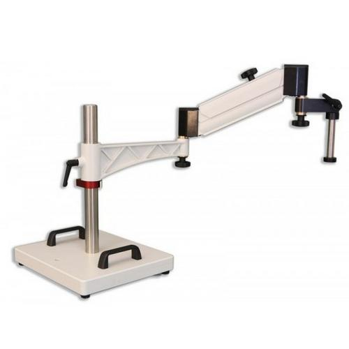 The SAS-2 Articulating heavy duty industrial-type boom stand comes with a 20mm diameter drop down mounting post to perfectly complement our EMZ (Zoom), EMT (Turret), EMF (Fixed) Series Stereo Microscope with the proper focus block. Lift Articulating Arm offers the greatest amount of reach along with ease to vertical positioning. The total arm length gives the user a total of 37” from the center of the vertical pole to the center of the focus block. Approximately 15 inches vertical travel, plus/minus 7.5 inches from horizontal, is controlled via an adjustable gas spring counter balance providing a "safe" lift and descent. The counter balance also allows "free floating" of objects from 0- 20 lbs. An ambidextrous vertical position lock is provided. The arm also accepts the industry standard 5/8" "Bonder" pin focus blocks, when an optional OS-LAEA is ordered. The SAS-2 provides complete flexibility for smooth left to right horizontal and vertical movement and adjustment. The SAS-2 flexibility, allows it to glide over the work surface with none of the binding inherent in other boom stands. It is now possible to scan a large flat area, such as a printed circuit board, by simply guiding the microscope with your hands. This is best made heavy Duty Boom stand from U.S.A. There is zero friction motion from precision machined into cast housings along with a sturdy solid 80 lbs. metal 13 inch x 13 inch x 1.5 inch base with heavy duty rubber feet and ergonomic handles provides an excellent solution for heavy duty and industrial applications requiring smooth friction free travel. The SAS-2 Articulating Heavy Duty Boom Stand is most popular Ergonomic boom stand with vertical pillar, articulating arm and a 20mm drop down mounting post accepts industry standard focus blocks with a 20mm mounting hole. The SAS-2 is equipped with a 406.4mm (16”) vertical pole. The SAS-2 offers minimal space requirement and greatest possible amount stability for EM stereo system up to 30 lbs. There is no loss of stability even at its furthest travel. The SAS-2 can swing out of the way easily, clearing the workstation for other tasks. The horizontal arm can be moved freely and smoothly left to right or can be securely locked into position with our spring loaded handle knobs. The vertical column is used to compensate for taller specimen heights to accommodate the working distances of different microscope bodies. Anti-rotation is stabilized by a locking pin on the vertical post. The SAS-2 Articulating Heavy Duty Boom stand provides a comfortable amount of space for large Solar panels to large semiconductor and electrical components. The SAS-2 is supported by a 80.00 lbs. base. This boom stand is an affordable; low cost with high quality safety features makes this boom stand unmatched value in its class. This stand has ample height and long reach to work on an inspect small to large parts under the microscope. Ergonomic flexibility, chemical resistant paint finish and corrosion resistant stainless steel columns make this boom stand an excellent choice in labs and production facilities.