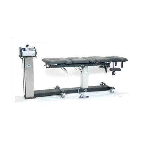 This table has a single high low motor with manual lumbar and thoracic extension. The table features include: retractable arm rests, neutral hand bars, bolster-less leg elevation system for supine treatment, friction free locking/unlocking lower section, adjustable tension spring and medical grade locking casters.