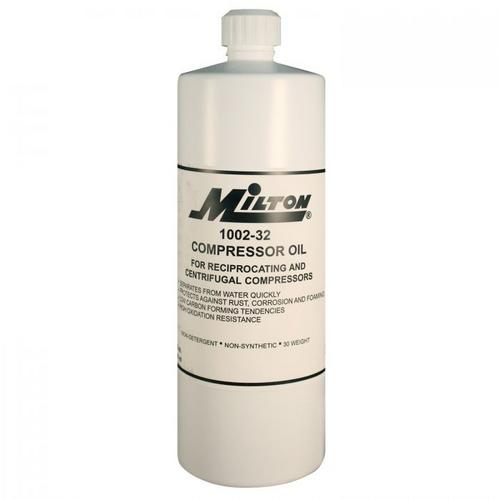 Milton air compressor oil protects against oxidation, corrosion, foaming, wear of metal parts and sludge buildup to ensure a longer compressor life. Featuring low carbon forming tendencies, this compressor oil will quickly separate from water. The non-synthetic ISO 68 grade compressor oil is for both reciprocating and centrifugal compressors where the manufacturer specifies a non-detergent 30 weight oil.