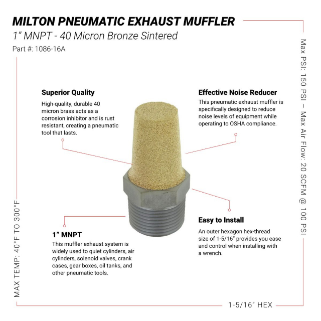 This 1 MNPT pneumatic exhaust muffler from Milton® is the perfect solution for reducing noise levels in the work environment. A combination exhaust muffler and micron filter