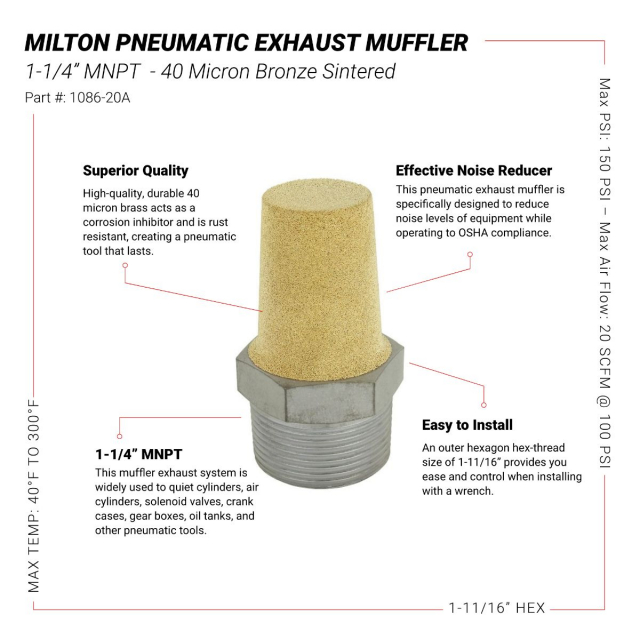 This 1 - 1/4 MNPT pneumatic exhaust muffler from Milton® is the perfect solution for reducing noise levels in the work environment. A combination exhaust muffler and micron filter