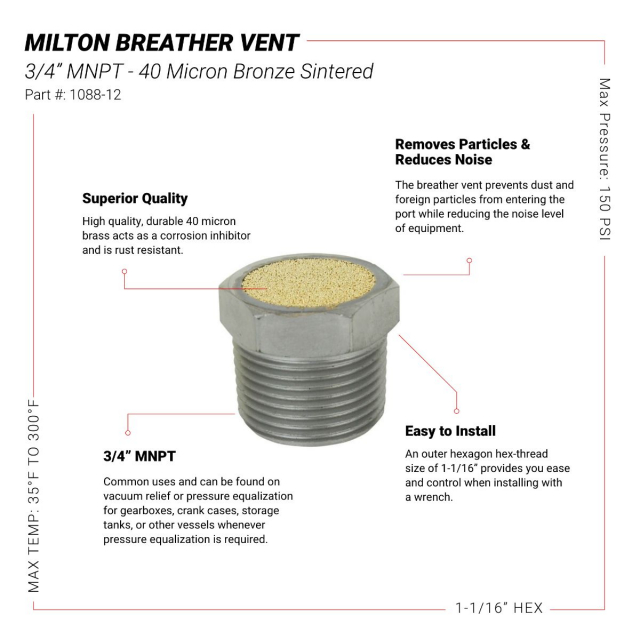 This pack of 5 - 3/4" MNPT breather vent from Milton® is the last pneumatic muffler you'll ever need. The air compressor muffler prevents dust and foreign particles from entering the port to the atmosphere by providing a vacuum relief or pressure equalization on gear boxes, oil tanks or reservoirs. The pneumatic air filter also uses micron to filter air while silencing, reducing noise levels in the work environment to OSHA - approved levels. Milton® compressed air pneumatic mufflers are composed of 40 micron sintered bronze bonded to a cooper plated pipe thread and 1 - 5/16" hex shape for quick assembly or removal. For a compact, effective noise reducer and a valve muffler that works, try this breather vent muffler.