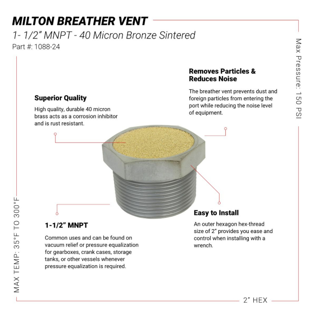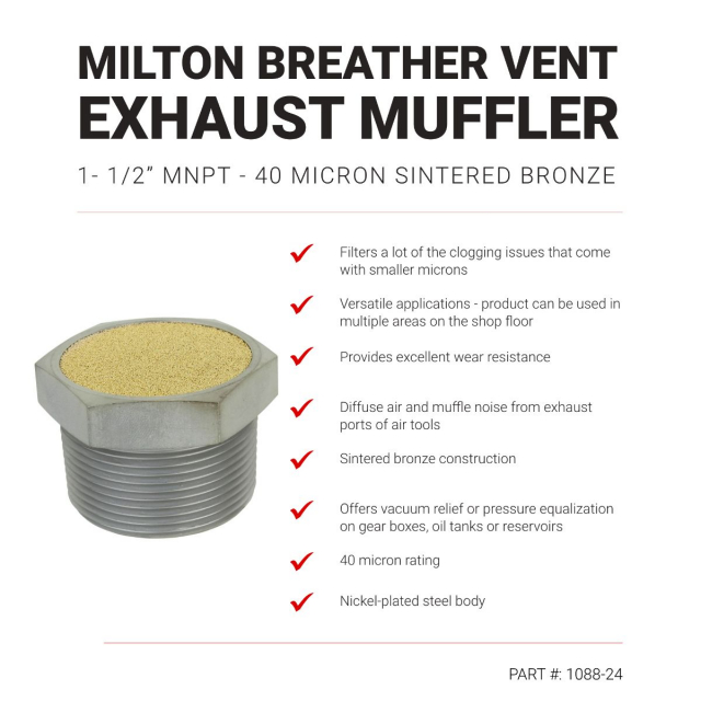 This 1 - 1/2" MNPT breather vent from Milton® is the last pneumatic muffler you'll ever need. The air compressor muffler prevents dust and foreign particles from entering the port to the atmosphere by providing a vacuum relief or pressure equalization on gear boxes, oil tanks or reservoirs. The pneumatic air filter also uses micron to filter air while silencing, reducing noise levels in the work environment to OSHA - approved levels. Milton® compressed air pneumatic mufflers are composed of 40 micron sintered bronze bonded to a cooper plated pipe thread and 1 - 5/16" hex shape for quick assembly or removal. For a compact, effective noise reducer and a valve muffler that works, try this breather vent muffler.