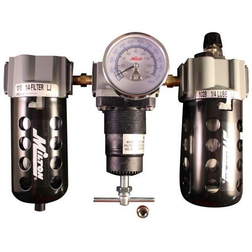 1/4" NPT Deluxe FRL trio is a filter, regulator and lubricator all in one. The filter has an automatic overnight drain, the regulator is the relieving type and the lubricator is drip style. This pre-assembled unit has polycarbonate bowls with metal bowl guards and includes a gage. Offers a Maximum of 150 PSI and 16 SCFM. 40 micron filter element.