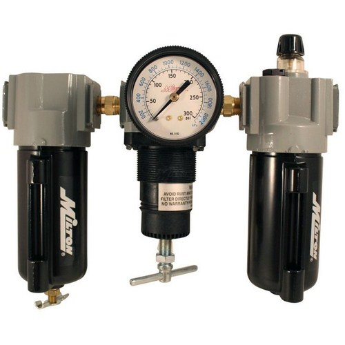 1/4" NPT Deluxe FRL trio is a filter, regulator and lubricator all in one. The filter has an automatic overnight drain, the regulator is the relieving type and the lubricator is drip style. This pre-assembled unit has metal bowls and includes a gage. Offers a maximum of 150 PSI and 16 SCFM. 40 micron filter element.