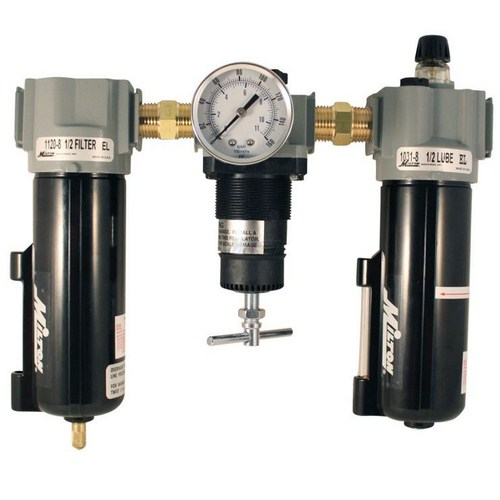 1/2" NPT Deluxe FRL trio is a filter, regulator and lubricator all in one. The filter has an automatic overnight drain, the regulator is the relieving type and the lubricator is drip style. This pre-assembled unit has polycarbonate bowls with metal bowl guards and includes a gage. Offers a maximum of 250 PSI and 100 SCFM. 40 micron filter element.