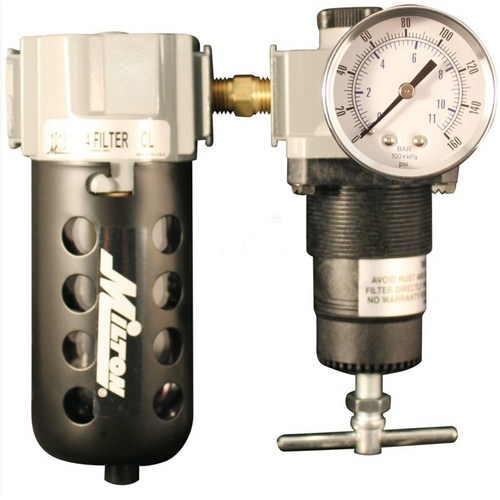 1/4" NPT deluxe FR duo combines the filter and regulator with brass fittings. The filter has an automatic overnight drain and the regulator is the relieving type. This pre-assembled unit has polycarbonate bowls with metal bowl guards and includes a gage. Offers a Maximum pressure of 150 PSI and 48 SCFM. 40 micron filter element.