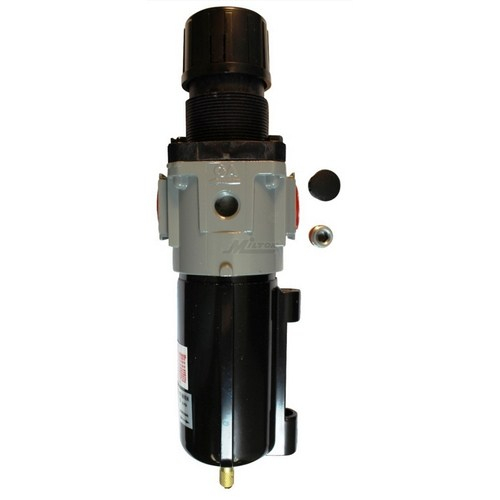 1/2" NPT piggyback duo has the features of the standard regulator, plus the space saving convenience of a combined filter. This piggyback filter regulator comes with a 6 ounce metal bowl and a 40 micron filter. With an automatic overnight drain and relieving regulator, this duo offers a non-rising adjustment and a 3 position knob to lock, adjust or remove. Has a Maximum pressure of 200 PSI and 100 SCFM.