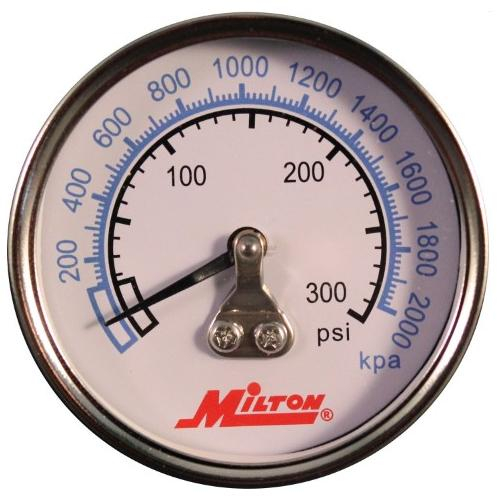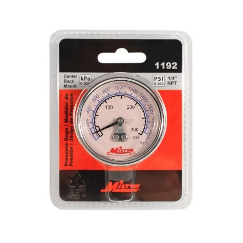 Use this pressure gauge for reliable service with compressors, regulators, air lines, pneumatic tools and equipment. Made up of a brass mechanism, ABS case and a polycarbonate lens, this gauge is resistant to heat, corrosion, water, salt water and oil. Can also be used in steam applications if less than 120 degrees Fahrenheit. The 1/4" NPT pressure gauge has a center back mount and offers a pressure range of 0 to 300 PSI. 2" face diameter.