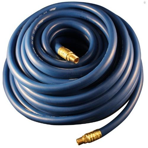 Thermoplastic PVC hose with 1/4" ID is lighter in weight than standard air hoses. For use with compressed air, water and/or mild chemicals, this 50 foot hose is resistant to oil, gasoline, abrasion and ozone effects. Assembled with 1/4" MNPT brass fittings on both ends, these PVC air hoses have a maximum working pressure of 250 PSI.