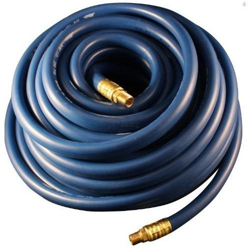 Thermoplastic PVC hose with 3/8" ID is lighter in weight than standard air hoses. For use with compressed air, water and/or mild chemicals, this 50 foot hose is resistant to oil, gasoline, abrasion and ozone effects. Assembled with 3/8" MNPT brass fittings on both ends, these PVC air hoses have a maximum working pressure of 250 PSI.
