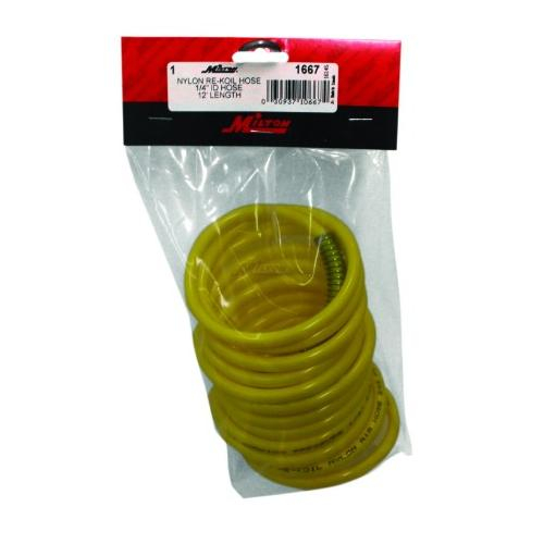 This 12 foot nylon ReKoil hose is assembled with reusable, full flow 1/4" MNPT swivel fittings on both ends to avoid twisting and kinking. Nylon re-koil hose is perfect for connecting to overhead air lines to keep the hose off the floor and resists abrasion. Maximum working pressure of 200 PSI at 70 degrees Fahrenheit.
