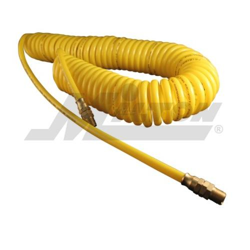 This polyurethane re-koil hose is assembled with re-usable, full flow 1/4" MNPT swivel fittings on both ends to avoid twisting and kinking. Polyurethane re-koil hose is perfect for connecting to overhead air lines to keep the hose off the floor and resists abrasion. Maximum working pressure of Box of 125 PSI at 70 degrees Fahrenheit.