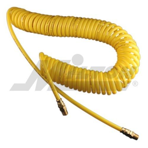 This polyurethane re-koil hose is assembled with re-usable, full flow 1/4" MNPT swivel fittings on both ends to avoid twisting and kinking. Polyurethane re-koil hose is perfect for connecting to overhead air lines to keep the hose off the floor and resists abrasion. Maximum working pressure of Box of 125 PSI at 70 degrees Fahrenheit.