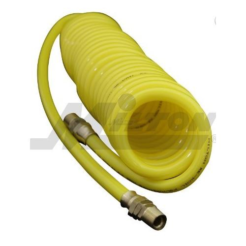 This 30 foot polyurethane re-koil hose is assembled with re-usable, full flow 3/8" MNPT swivel fittings on both ends to avoid twisting and kinking. Polyurethane re-koil hose is perfect for connecting to overhead air lines to keep the hose off the floor and resists abrasion. Maximum working pressure of Box of 125 PSI at 70 degrees Fahrenheit.