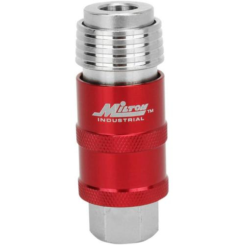 Milton's 5-in-1 Universal Industrial Safety Exhaust couplers are designed to safely bleed off air pressure before releasing the connector. The safety exhaust feature allows for safe disconnection, eliminating potentially dangerous hose whip. The coupler remains connected to the plug while pressurized air is safely bled off. Constructed of heavy-duty steel which is ideal for applications requiring a durable and long lasting pneumatic coupler.