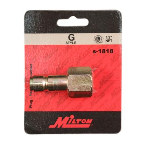 1/2 " FNPT G style plugs are made of case hardened steel and are plated to resist rust. G style couplers and plugs have a 1/2" basic flow size and a maximum of 300 PSI. Offering air flow of up to 99 SCFM, Milton G style couplers and plugs are perfect for applications that require over 60 SCFM.
