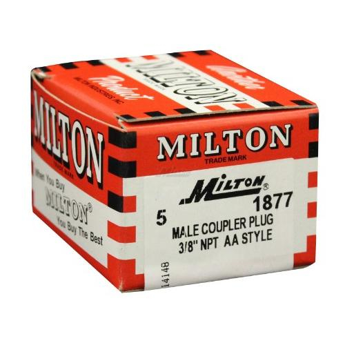Milton AA style plugs are made of case hardened steel and are plated to resist rust. Featuring a push type sleeve, this 3/8" MNPT AA style plug has a basic flow size of 3/8" and a maximum inlet pressure of 300 PSI. Air flow of 59 SCFM.