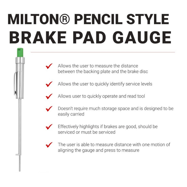 Milton's® Pencil Style Brake Pad Gauge allows you to quickly measure the external & internal brake pads to help identify if a vehicle has a sufficient amount of brake pad lining. Milton® pencil tire gauge is uniquely designed with an easy to use and readable color code scale - Red = Replace, Yellow = Caution, Green = Safe. Manufactured from durable lightweight steel to ensure long term performance. Constructed to be compact and calibratable for portable ease. Reads from 0 - 20 mm. Milton provides the top line solutions to all pneumatic automotive service applications.