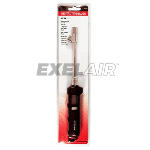 This long reach dual heal chuck is specifically designed for an easy reach into dual tire valves. The convenient metal dual head chuck swivels 360 degrees, offering additional ease on large trucks and duallies. The backlit display reads in both pounds per square inch as well as kilopascal and includes an automatic shutoff after 30 seconds. The built in flashlight creates an additional safety feature for all hour roadside emergencies. Its all metal handle is surrounded by a slip resistant rubber grip, making this tool a necessity for roadside safety. Includes 2 AAA batteries.
