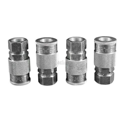 Four pack of 3/8" FNPT H style couplers are used in larger tool applications requiring more SCFMs. With a basic flow size of 3/8", these couplers have a maximum pressure of 300 PSI and a maximum air flow of 67 SCFM. Made of case hardened steel, these couplers are complete with Buna-N seals.