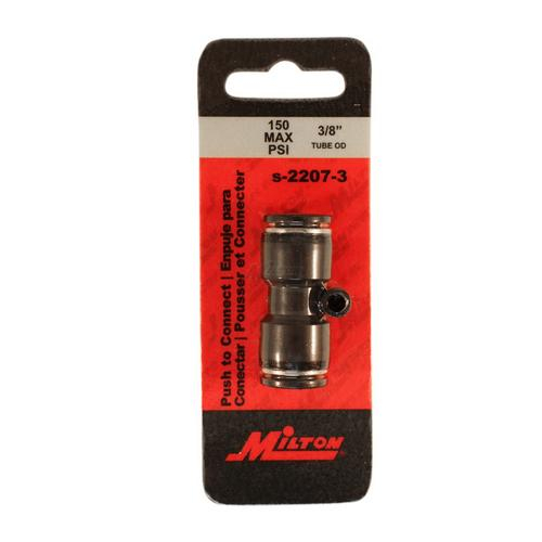 3/8" OD nylon straight union tube fitting has offer easy installation of air lines by simply pushing tubing into fitting with no gluing or special tools required. Reusable by simply pushing sleeve in and releasing the tubing. Ideal for splicing or repair, these push to connect tube fittings are designed for use with nylon, polyurethane, or low and high density polyethylene tubing. Great for garage or shop, Milton push to connect tube fittings allow for maximum air flow and faster connection than standard compression fittings.