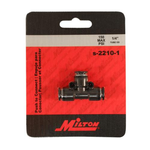 Tee union nylon push to connect tube fittings offer easy installation of air lines by simply pushing tubing into fitting, no gluing or special tools required. These reusable push to connect fittings have a 1/4" OD and allow maximum air flow and faster connection than standard compression fittings. Milton nylon push to connect tube fittings are designed for use with nylon, polyurethane, or low and high density polyethylene tubing. Reusable by simply pushing sleeve in and release the tubing. Great for garage or shop, tee fittings pivot 360 degrees Fahrenheit or ease of installation.