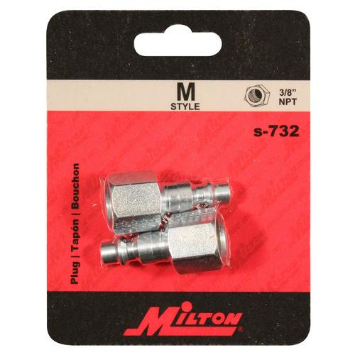 3/8" FNPT M style plugs are made of case hardened steel and are plated to resist rust. The industry standard M style plug has a 1/4" basic flow size and a maximum pressure of 300 PSI. M style plugs offer air flow of 40 SCFM.
