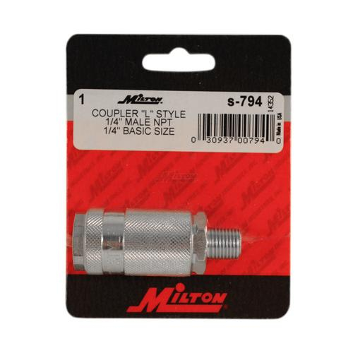 1/4" MNPT L style coupler has a 1/4" basic flow size and is steel plated to resist rust. Accepts the following Milton L style plugs: 792 and 791.