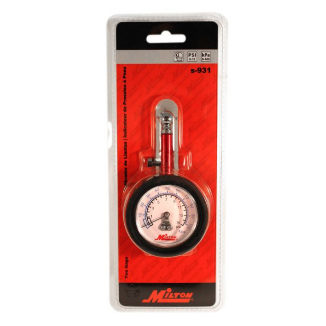Dial type tire gage with internal diaphragm construction offers greater durability. 45 degree chuck head has a pressure range of 0-15 PSI and includes a deflator valve. Complete with a rubber boot for added durability.