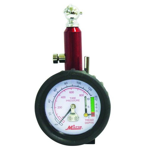 Tire gauge with tire tread depth gauge offers a pressure range of 0-120 PSI. Dial type gauge with internal diaphragm construction for greater durability. Built in tire tread gage. 47 degree chuck head with deflator valve. Durable rubber boot for added durability.