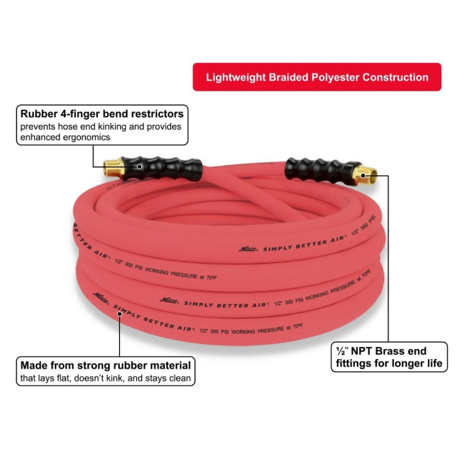 Built to withstand every extreme, the Milton® 1/2" Ultra Lightweight Rubber Air Hose offers the durability of typical rubber hoses while maintaining the ultra - lightweight convenience of a hybrid hose. The oil - resistant core tube and cover resist abrasion and strain and will not break down over time, while the brass National Pipe Fitting 1/2" thread ends are built with bend restrictor ergonomic handle grips for leak - resistant performance. 40% more lightweight than traditional rubber hoses, this lightweight hose connector offers the flexibility of functioning in extreme conditions. The strong rubber material allows for optimal performance in temperatures ranging from - 50°F to 190°F, with a Maximum Operating Pressure of 1,200 PSI and a Max Working Pressure of 300 PSI. The flexibility and strong ozone resistance ensure that the hose will not kink or leak, making it easy to carry, lift, and maneuver in the field. The hose can be easily rolled up, transported between work environments, and used in extreme weather. With a 25 foot reach, made out of strong rubber material, this non - tangle hose is built to last.