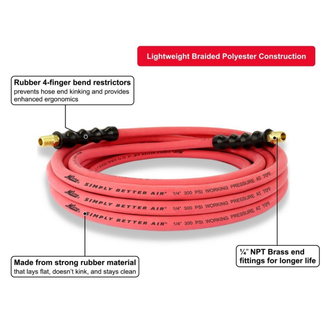 Built to withstand every extreme, the Milton® 1/4" Ultra Lightweight Rubber Air Hose offers the durability of typical rubber hoses while maintaining the ultra - lightweight convenience of a hybrid hose. The oil - resistant core tube and cover resist abrasion and strain and will not break down over time, while the brass National Pipe Fitting 1/2" thread ends are built with bend restrictor ergonomic handle grips for leak - resistant performance. 40% more lightweight than traditional rubber hoses, this lightweight hose connector offers the flexibility of functioning in extreme conditions. The strong rubber material allows for optimal performance in temperatures ranging from - 50°F to 190°F, with a Maximum Operating Pressure of 1,200 PSI and a Max Working Pressure of 300 PSI. The flexibility and strong ozone resistance ensure that the hose will not kink or leak, making it easy to carry, lift, and maneuver in the field. The hose can be easily rolled up, transported between work environments, and used in extreme weather. With a 25 foot reach, made out of strong rubber material, this non - tangle hose is built to last.