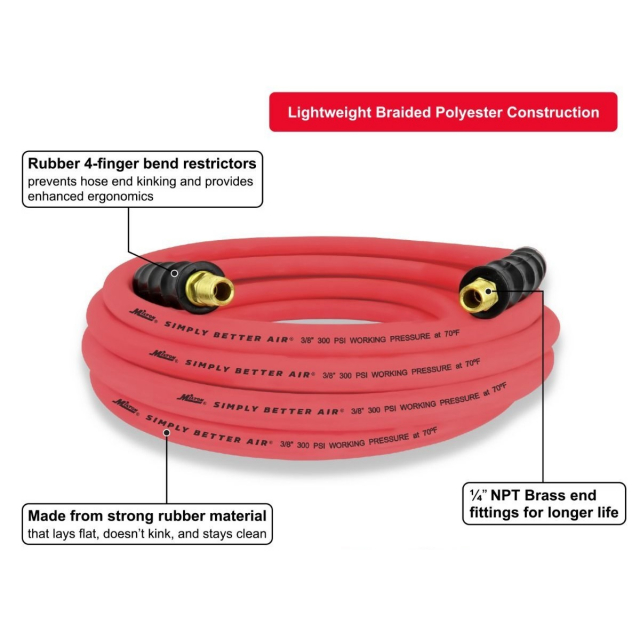 Built to withstand every extreme, the Milton® 3/8" Ultra Lightweight Rubber Air Hose offers the durability of typical rubber hoses while maintaining the ultra - lightweight convenience of a hybrid hose. The oil - resistant core tube and cover resist abrasion and strain and will not break down over time, while the brass National Pipe Fitting 1/4" thread ends are built with bend restrictor ergonomic handle grips for leak - resistant performance. 40% more lightweight than traditional rubber hoses, this lightweight hose connector offers the flexibility of functioning in extreme conditions. The strong rubber material allows for optimal performance in temperatures ranging from - 50°F to 190°F, with a Maximum Operating Pressure of 1,200 PSI and a Max Working Pressure of 300 PSI. The flexibility and strong ozone resistance ensure that the hose will not kink or leak, making it easy to carry, lift, and maneuver in the field. The hose can be easily rolled up, transported between work environments, and used in extreme weather. With a 25 foot reach, made out of strong rubber material, this non - tangle hose is built to last.