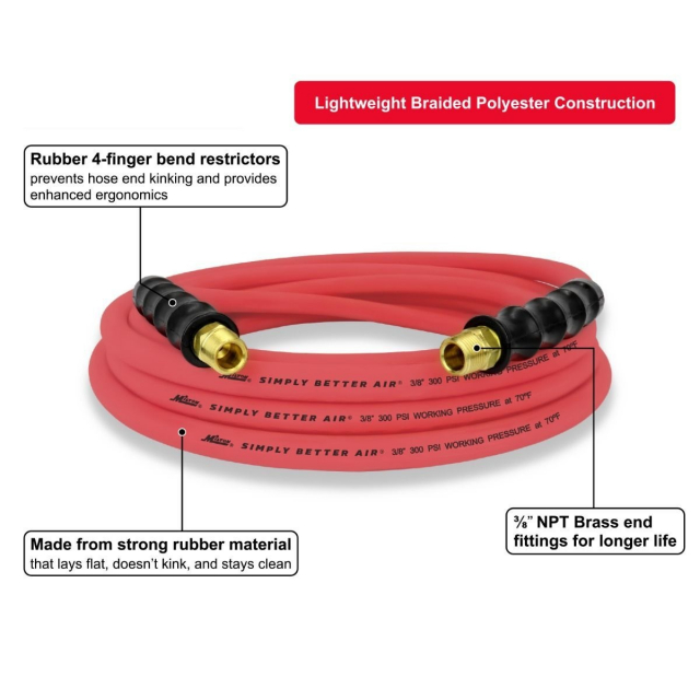 Built to withstand every extreme, the Milton® 3/8" Ultra Lightweight Rubber Air Hose offers the durability of typical rubber hoses while maintaining the ultra - lightweight convenience of a hybrid hose. The oil - resistant core tube and cover resist abrasion and strain and will not break down over time, while the brass National Pipe Fitting 3/8" thread ends are built with bend restrictor ergonomic handle grips for leak - resistant performance. 40% more lightweight than traditional rubber hoses, this lightweight hose connector offers the flexibility of functioning in extreme conditions. The strong rubber material allows for optimal performance in temperatures ranging from - 50°F to 190°F, with a Maximum Operating Pressure of 1,200 PSI and a Max Working Pressure of 300 PSI. The flexibility and strong ozone resistance ensure that the hose will not kink or leak, making it easy to carry, lift, and maneuver in the field. The hose can be easily rolled up, transported between work environments, and used in extreme weather. With a 25 foot reach, made out of strong rubber material, this non - tangle hose is built to last.