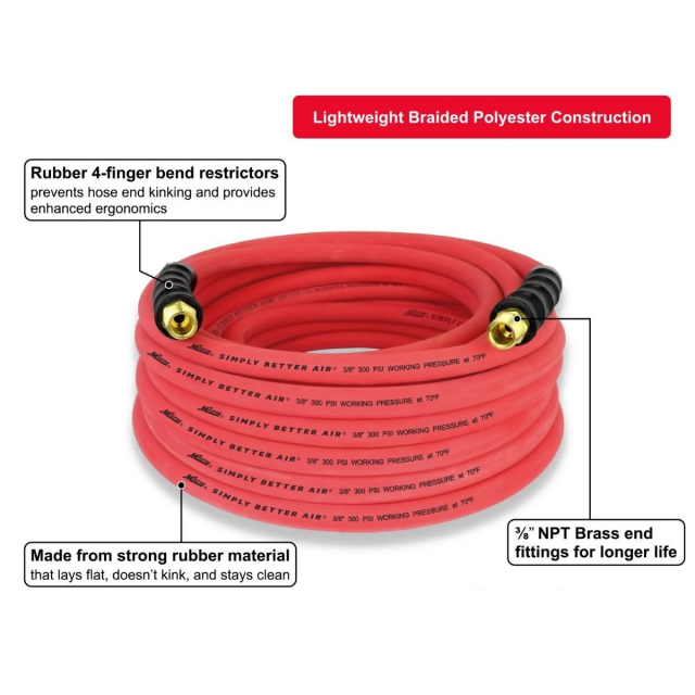 Built to withstand every extreme, the Milton® 3/8" Ultra Lightweight Rubber Air Hose offers the durability of typical rubber hoses while maintaining the ultra - lightweight convenience of a hybrid hose. The oil - resistant core tube and cover resist abrasion and strain and will not break down over time, while the brass National Pipe Fitting 3/8" thread ends are built with bend restrictor ergonomic handle grips for leak - resistant performance. 40% more lightweight than traditional rubber hoses, this lightweight hose connector offers the flexibility of functioning in extreme conditions. The strong rubber material allows for optimal performance in temperatures ranging from - 50°F to 190°F, with a Maximum Operating Pressure of 1,200 PSI and a Max Working Pressure of 300 PSI. The flexibility and strong ozone resistance ensure that the hose will not kink or leak, making it easy to carry, lift, and maneuver in the field. The hose can be easily rolled up, transported between work environments, and used in extreme weather. With a 50 foot reach, made out of strong rubber material, this non - tangle hose is built to last.