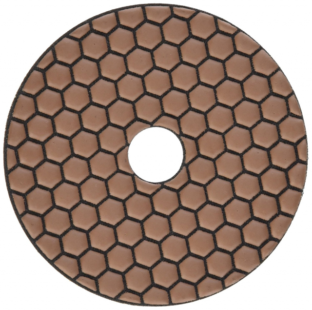 Flexible, 4" diameter Hook & Loop backed disc for dry polishing granite and marble. Max 3,700 RPM.